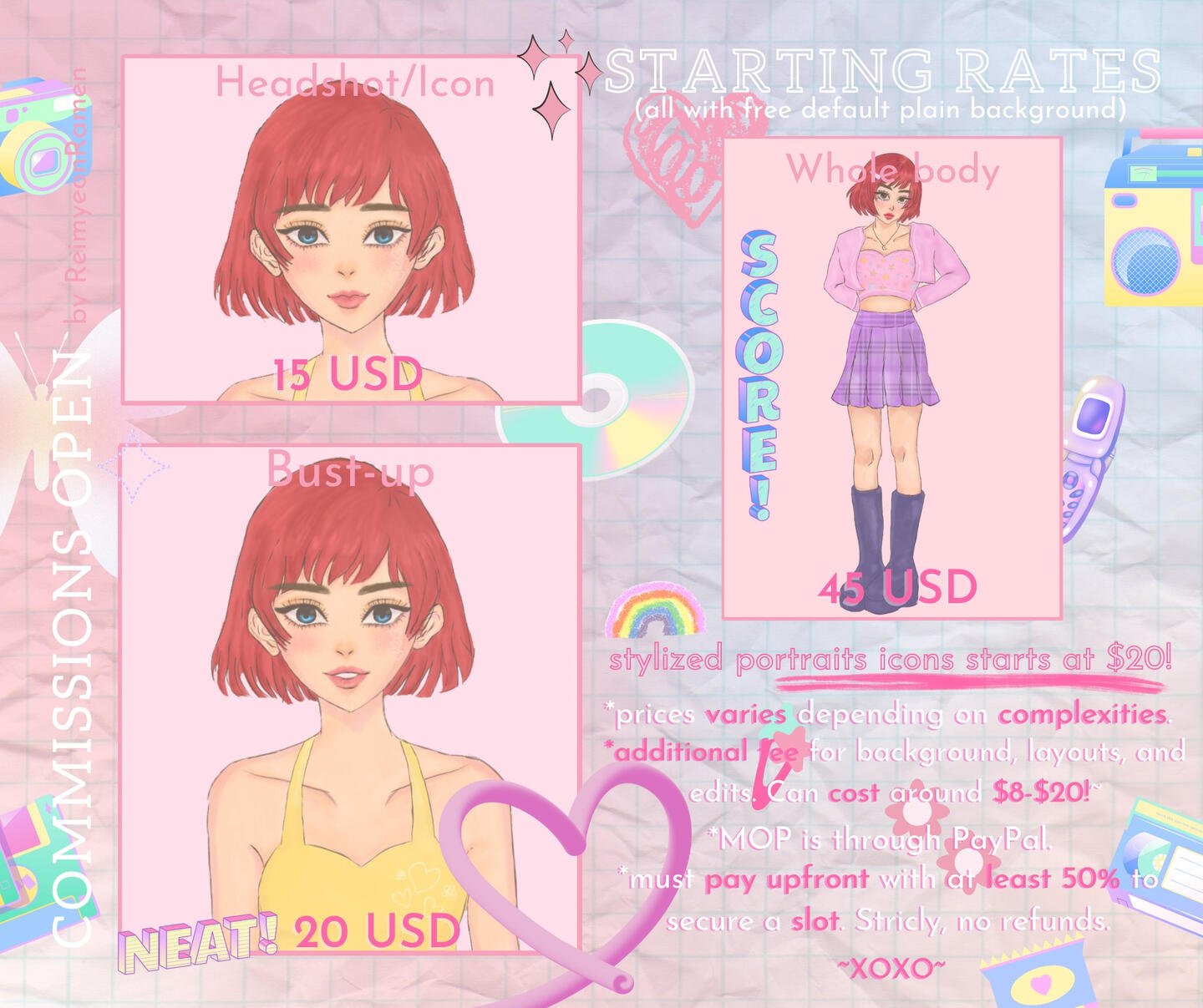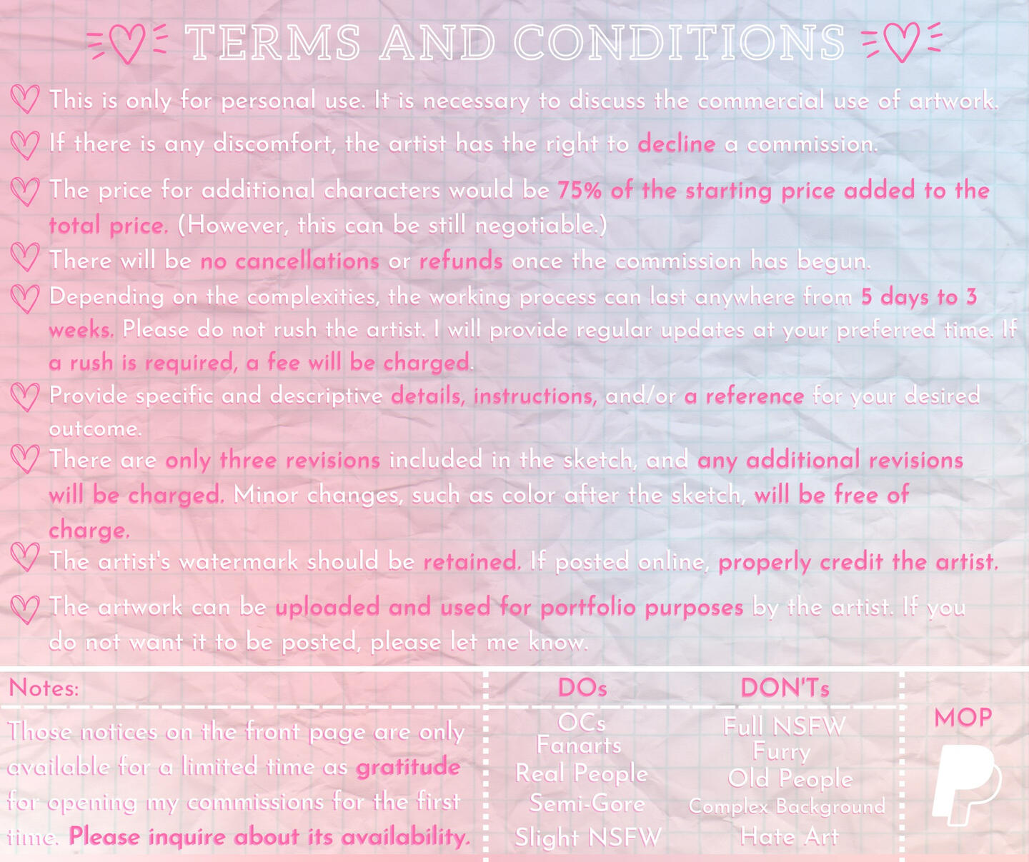 Terms of Service for reimyeonramen's Digital Art Commissions:1. Commission Requests: To request a digital art commission, please provide clear and detailed specifications, including reference images, desired art style, and any specific requirements or preferences.2. Pricing and Payment: Prices for commissions will be determined based on the complexity, size, and estimated time required for completion. A 50% non-refundable deposit is required before the start of the commission, with the remaining balance due upon completion.3. Revisions: Minor revisions are included in the commission fee. Major revisions or additional changes requested after completion may incur an extra fee.4. Artistic License: As the artist, I reserve the right to exercise artistic license and make creative decisions in the best interest of the artwork, while still adhering to the client's original vision.5. Usage and Copyright: The commissioned artwork remains the intellectual property of reimyeonramen, allowing for personal, non-commercial use by the client. The artist retains the right to display the artwork in their portfolio or for promotional purposes.6. Communication and Delivery: Regular communication will be maintained throughout the commission process. The final artwork will be delivered digitally in a high-resolution format, suitable for personal printing or online display.7. Cancellation and Refunds: Commission requests may be canceled by either party before the completion of the artwork. In the event of cancellation, the non-refundable deposit will not be returned.By requesting a digital art commission from reimyeonramen, you agree to the above terms and conditions. I strive to provide exceptional service and create artwork that exceeds your expectations. Thank you for choosing reimyeonramen for your artistic needs!